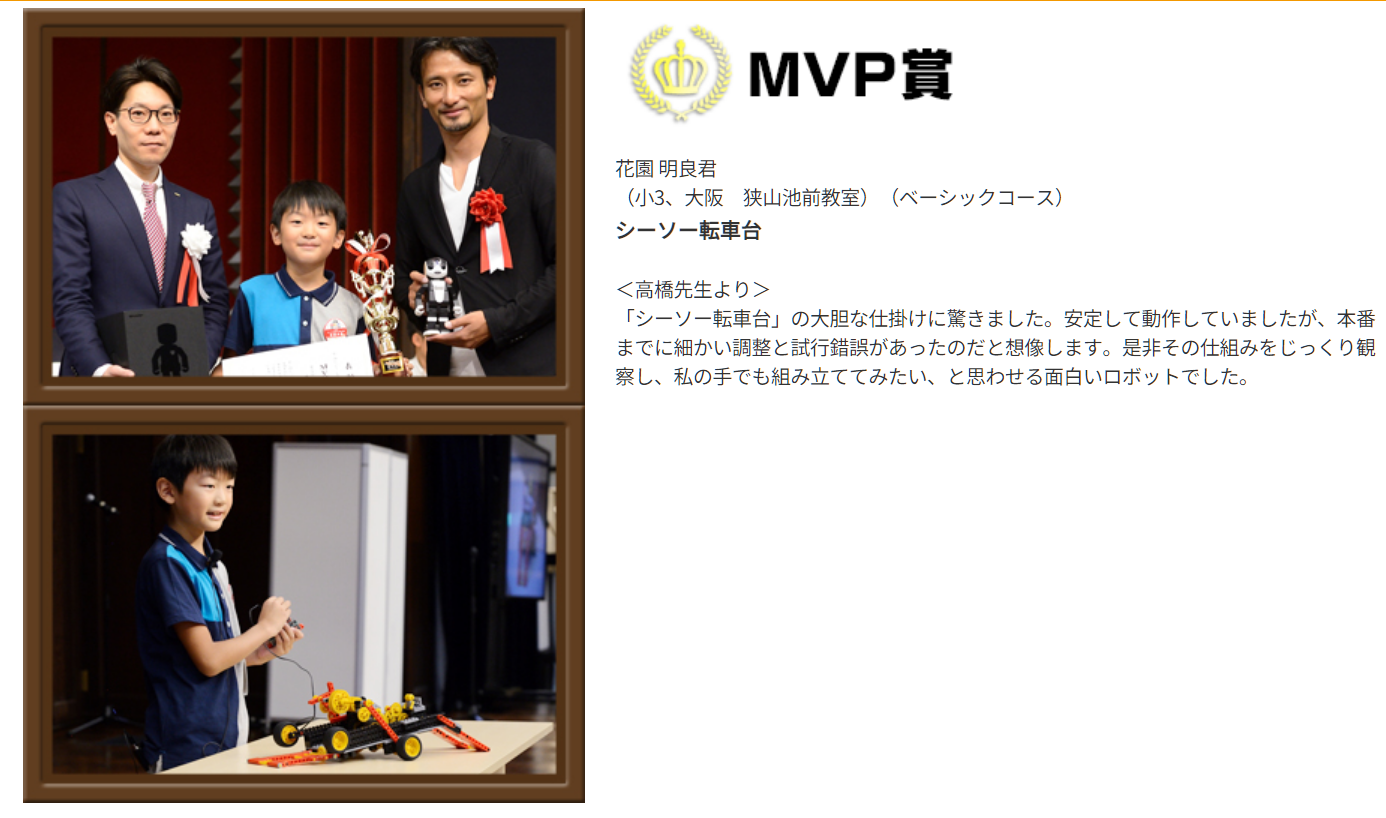 出張叶真実君(狭山池前教室)は、電車と転車台を作成しアドバンスコースのアイデア部門で出場し、全参加者の中で最も優れた発表に贈られる『MVP』を見事受賞されました!